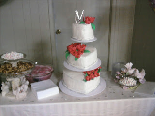 Below is the wedding cake that I did last friday for my in-laws 35th wedding anniversary. This is my first official "whole" wedding cake. The reason I say that is because for my youngest brother-in-law I did decorate the cake but thats all I did. My mother-in-law baked and iced it. These are heart shaped cakes with fantasy flowers made of fondunt and gumpaste. All the dove stuff (holding peanuts and mints) were from my wedding. Even my cake knife and server is there, the knife saying "Robert and Maranda" and My server saying "September 13, 2003" or maybe thats the other way around. Oh well. Oh crap! That means my 8th anniversary is coming up quickly!